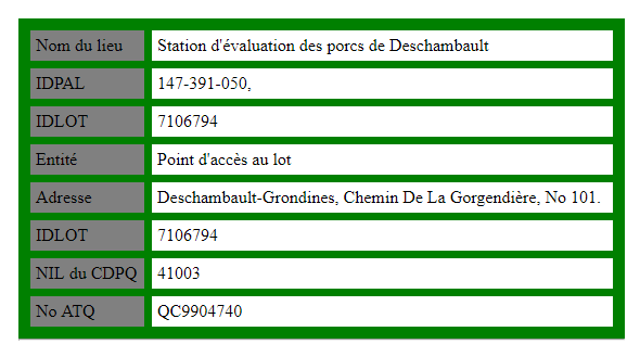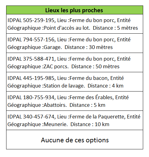 Le cellulaire affiche l'information (Entité. No point d'accès, adresse, no de lot et le no de traçabilité) des cinq entités géographiques les plus proches du cellulaire.